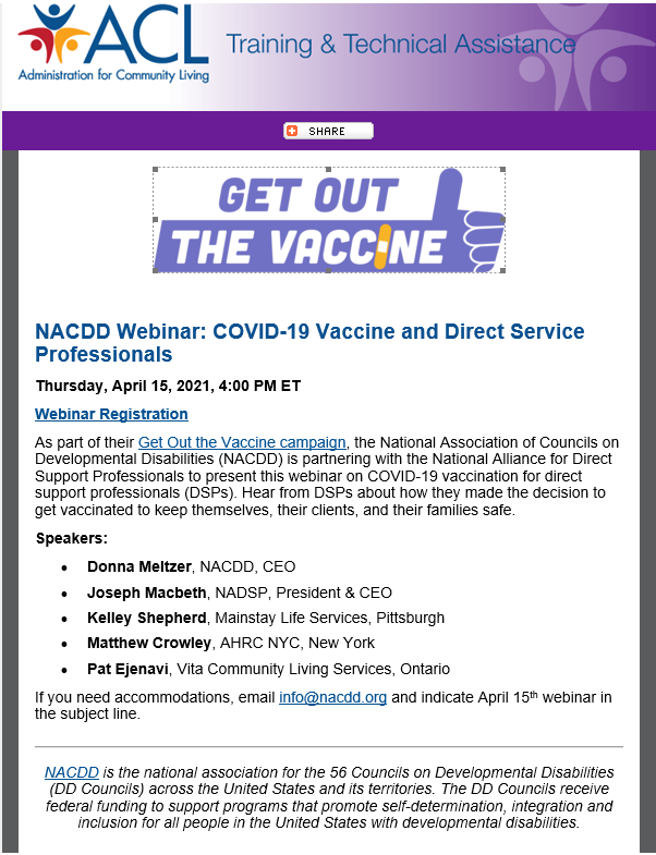 NACDD Webinar: COVID 19 Vaccine and Direct Service Professionals