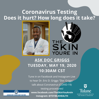 Dr. Eric Griggs is collaborating with the Louisiana COVID-19 Health Equity Task Force and the Tulane University School of Public Health and Tropical Medicine to host a virtual Question and Answer session about Coronavirus Testing. This event will be held on Tuesday, May 19, 2020 at 10:30 am on Facebook and Instagram Live.
