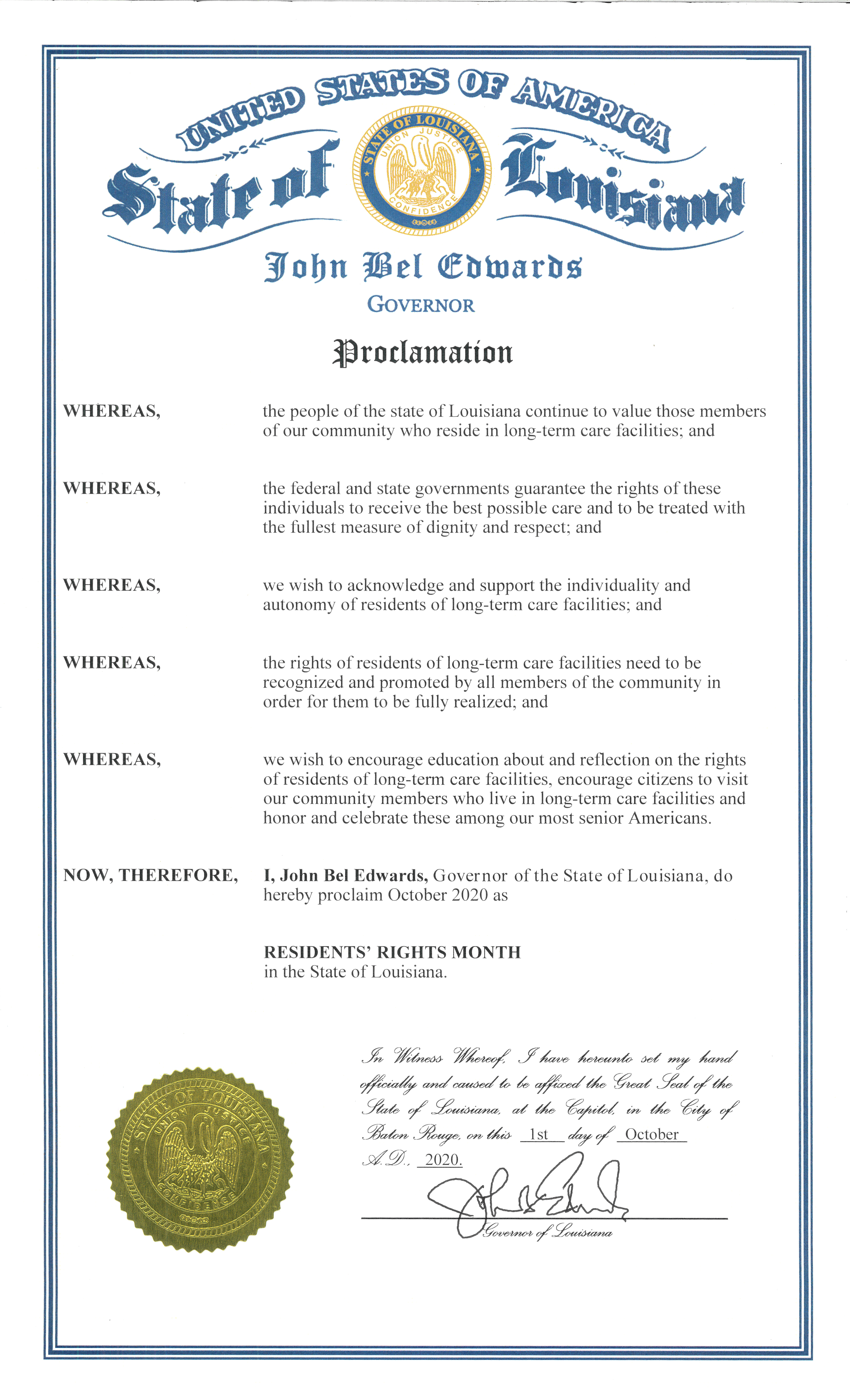 Governor Edwards Proclaims October is Nursing Home Residents' Rights Month
